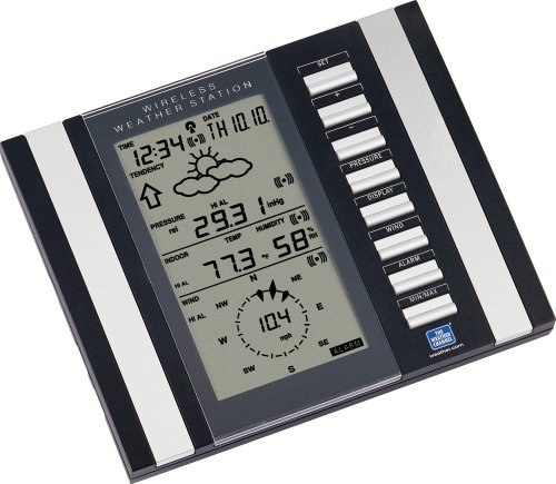This device is geared to the serious weather nerd rather than the amateur as it gives a more complete picture of weather patterns and has more complicated accessories and a more complex screen to decipher for readings. About the size of a thermostat, the base unit mounts on a tabletop or wall and has numerous wireless gadgets that feed information into the weather center. First, the station reports the humidity and temperature in Fahrenheit and Celsius for indoor locations and outdoor locations using a remote sensor positioned up to 80 feet away. The weather station records the minimum and maximum temperatures and humidity readings within a 24-hour period and recalls them at your prompting. The unit also displays wind chill and dew point temperatures for folks looking for very exact weather information.Other features of this station include a weather tendency indicator, which predicts weather for the next 12- to 20-hour time period based on air pressure changes in easy-to-understand grapichal icons. Air pressure, either absolute or relative, is shown just below the weather forecast icon in inHg or hPa. A remote wind transmitter provides detailed information on wind speed and the weather station reports measurements in mph, km/h, m/s, knots, or Beaufort. The base unit also shows wind direction via an easy-to-read compass display. This kit also includes a remote rain transmitter, which measures and displays data on rainfall for 1-hour and 24-hour periods and also provides a total rainfall amount in either millimeters or inches. The wireless station even has a storm warning alarm to give you ample time to prepare for foul weather.