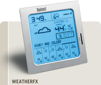 No sensors, No installation, No subscription. Our WeatherFX weather forecasters provide precise weather data without the ongoing commitment, upkeep and obtrusive setup of other systems. They deliver reliable, realtime forecasts 24/7 from the world’s weather authority – Accuweather. This pinpoint information is available for over 150 cities. Once you pick your city, the forecast is automatically updated every 15 minutes via pager technology. And the network-synchronized clock never needs resetting. The ultimate outdoor planner. Errands on Saturday, big hike on Sunday. Or, wind direction says hunt the ridge, not the bean field. No matter your passion, our latest technological break-throughs in weather forecast information will prove tools of unmatched value to those who live to be outside. Color-changing backlight Based on temperature, WeatherFX changes color so you know conditions at a glance. 5 Day size 8.25 x 8.25 x 3. Uses four AAA Batteries or A/C.Cheap "Bushnell 5-Day Weather FX Alarm (Silver)" Discount Review Shop