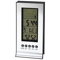 - Features temperature in Fahrenheit and Celsius from -58ºF to 158ºF, humidity from 20% to 99%, weather forecast, 12/24 hour clock with alarm and snooze, calendar with day, week, month, and year and lunar phase