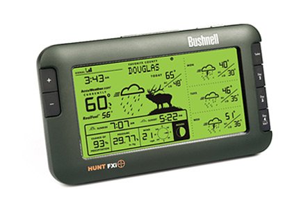 The Bushnell 7-Day Hunt FXI Internet Weather Forecaster delivers reliable and accurate forecasting with no-strings-attached functionality for avid hunters and outdoors people alike. Designed and engineered with internet-driven technology, this device provides solunar data and weather information for over 3,000 locations within the United States and Canada without sensors, subscriptions, or wires--so that you can leave the grid, yet stay in the know.The Hunt FXI offers morning, afternoon, and evening forecasts for today and the next three days. Solunar data and forecasting information includes: sunrise and sunset times, chance of precipitation, barometric pressure and trend, wind speed and direction, moon phase, and more. Additional functions featured in the Hunt FXI include: a color changing backlight that indicates temperature at-a-glance, 5 programmable favorite U.S. and Canadian counties, an auto-synchronized (Internet) clock, and an alarm function with snooze. The Hunt FXI comes complete with a USB transmitter, a power adapter, CD software, and a stand. A/C or battery powered, the Hunt FXI uses four AA batteries (sold separately), measures 7.3 x 4.25 x 2.75 inches, and is backed by a 1-year warranty.