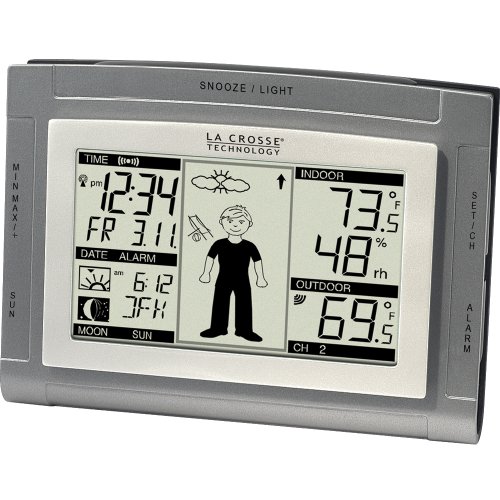 This unique weather station features Oscar the Weatherman, an icon who changes his outfit based on changing barometric pressure and temperature. Displays indoor and wireless outdoor temperature in degreesF or degreesC. Also indicates indoor relative humidity, moon phase, radio-controlled time, perpetual calendar, and calculates sunrise and sunset times based on selected city. Station can be wall hanging or free standing. Requires 5 AA alkaline batteries (not included). Approximate size, 4 1/4" x 6 x 1".Cheap "Wireless Sun/Moon Forecast Station with Oscar Outlook" Discount Review Shop